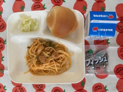 今日の給食は、チキントマトスパゲッティ、キャベツのピクルス、ミニフィッシュ、ミニコッペパン、牛乳です。