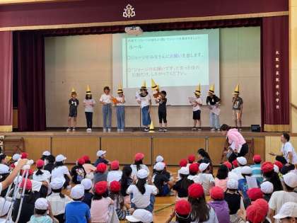 講堂では、おさるのジョージの言う通りでたてわり班の友だちと楽しみました。