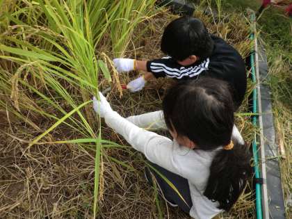 子どもたちは、上手にかまを使って稲刈りをしました。