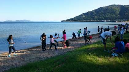 避難訓練を終えた後、夕食まで、湖岸で水切り大会をしました!