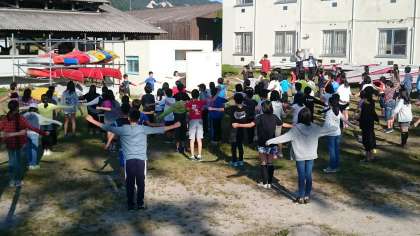 朝の集いです。子どもたちは、昨日の疲れもなく、朝早くから起きて今日の活動を楽しみにしてる様子でした。しっかりと体操して、これから朝ご飯です!