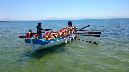 リーダーの「そ〜れ!」の号令に合わせて、「い〜ちに!」と元気良く掛け声をかけながら、“かい”を漕ぎます!