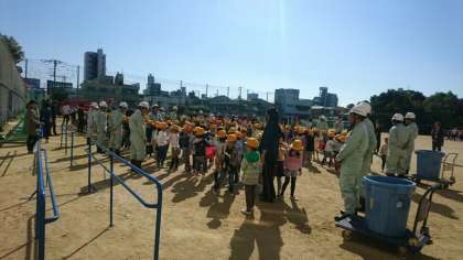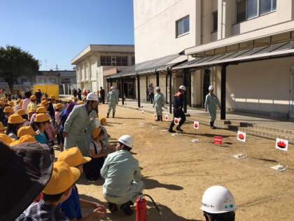 また、消火訓練として、低学年は実際に水を入れてバケツリレーを、高学年は水消火器を使って火を消す訓練をしました。