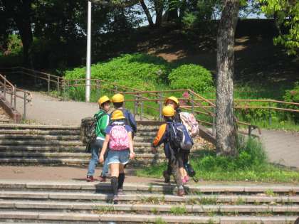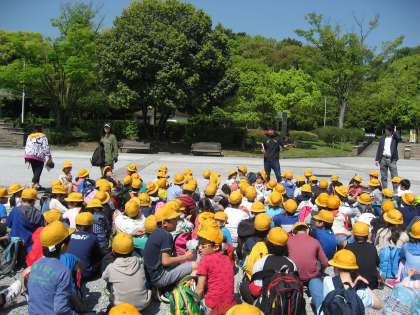 28日(金)に4年生は春の遠足で服部緑地に行きました。天気にも恵まれ、爽やかな青空の下、学校を出発しました。朝の御堂筋線は混み合っていましたが、車内ではみんな静かに、また乗り降りする人に注意を払いながら、服部緑地駅に着くことができました。