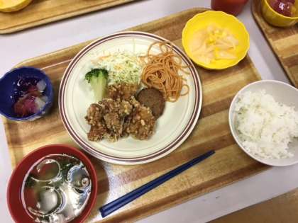 今晩のメニューは、唐揚げ、ハンバーグ、スパゲッティ、フルーツゼリー、ワカメの味噌汁です。
