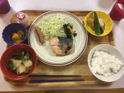 今朝のメニューは、焼き鮭、ソーセージ、野菜、味噌汁、デザートです。
