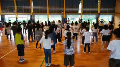 雨が降っているので体育館で行っています。今日もがんばって活動します!