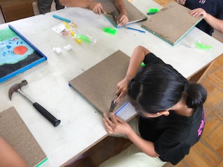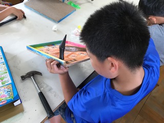 釘の位置を慎重に確かめながら、金槌でコンコンコンと打っていきます。最初は思った場所に打てずに苦労していましが、やっていくうちにコツを掴んで、釘も真っ直ぐに打つことができていました。