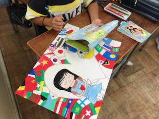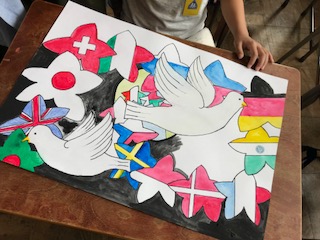 6年生らしく、絵の構成や色使いが大変工夫されています。「平和」という同じテーマでも、一人ひとりのイメージや表現の仕方が異なっているのが、興味深いです。