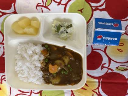 今日の給食は、ビーフカレーライス、野菜のピクルス、りんごのかんづめ、牛乳です。