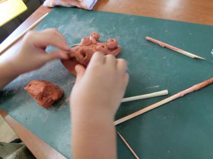 初めて触る土ねんどでも表面を丁寧になぞったり顔の土台と鼻を水を工夫してくっつけたりと一生懸命作成していました。