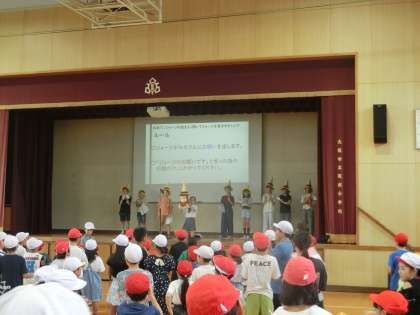 講堂では、「おさるのジョージの言う通り」を行いました。