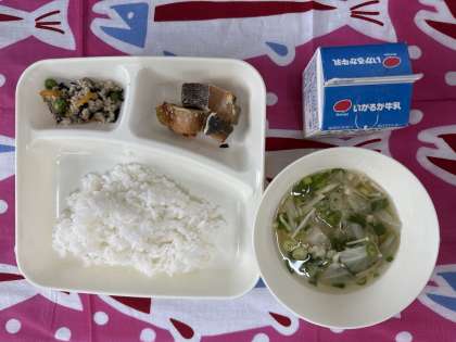今日の給食は、さけのしょうゆだれかけ、五目汁、高野どうふのいり煮、ごはん、牛乳です。
