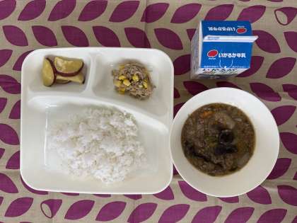 今日の給食は、マーボーなす、ツナと野菜のいためもの、焼きさつまいもの甘みつかけ、ごはん、牛乳です。