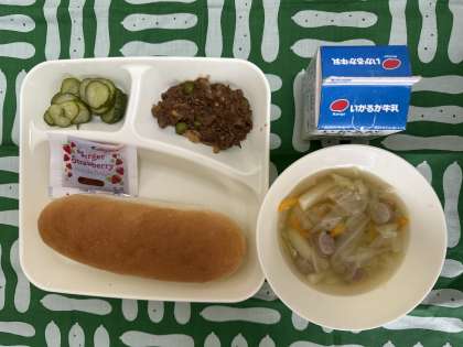 今日の給食は、牛肉のデミグラスソース煮、ウインナーのスープ、きゅうりのピクルス、コッペパン、いちごジャム、牛乳です。