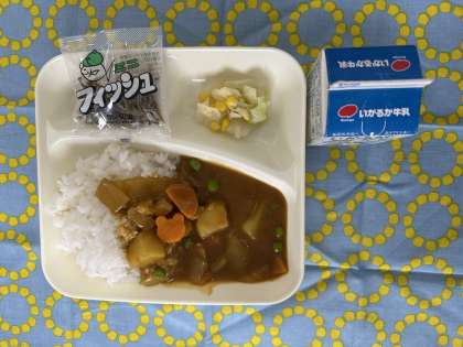 今日の給食は、チキンカレーライス、キャベツとコーンのサラダ、ミニフィッシュ、牛乳です。
