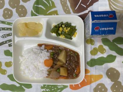 今日の給食は、ハヤシライス、グリーンアスパラガスとコーンのサラダ、洋なしの缶づめ、牛乳です。
