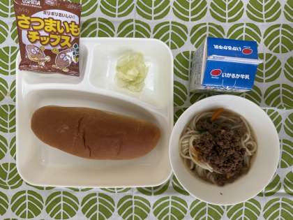 今日の給食は、タンタンめん、キャベツの甘酢づけ、おさつチップス、黒糖パン、牛乳です。