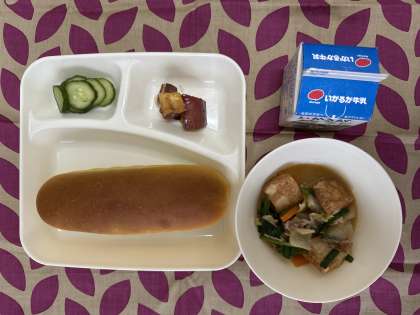 今日の給食は、中華煮、大学いも、あっさりきゅうり、パンプキンパン、牛乳です。