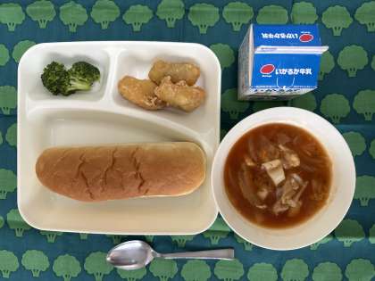 今日の給食は、白身魚フリッター、ミネストローネ、ブロッコリーのサラダ、おさつパン、牛乳です。