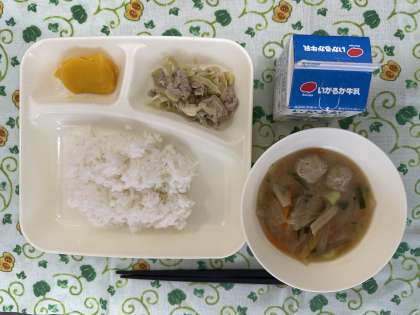 今日の給食は、豚肉と野菜のいためもの、いわしのつみれ汁、かぼちゃういろう、ごはん、牛乳です。