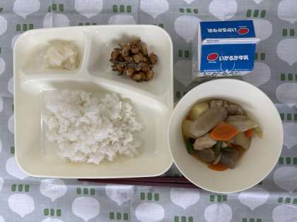 今日の給食は、鶏肉と野菜の煮もの、じゃこ豆、かぶのゆず風味、ごはん、牛乳です。