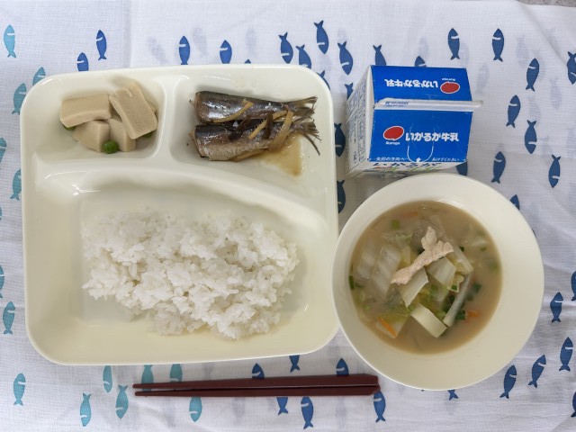 今日の給食は、いわしのしょうが煮、みそ汁、高野どうふの煮もの、ごはん、牛乳です。