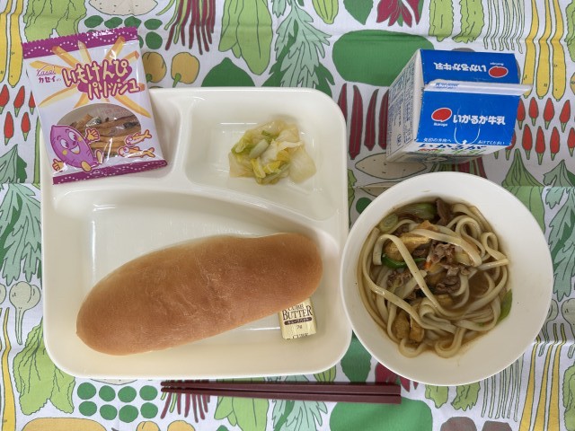 今日の給食は、カレーうどん、はくさいのおひたし、いもけんぴフィッシュ、コッペパン、バター、牛乳です。