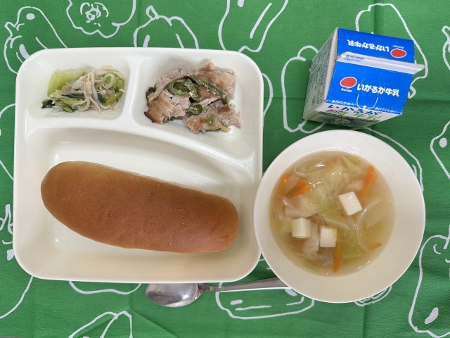 今日の給食は、豚肉のオイスターソース焼き、中華スープ、チンゲンサイともやしの中華あえ、黒糖パン、牛乳です。
