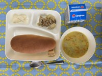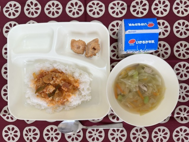 今日の給食は、ケチャップライス、スープ、れんこんフライ、牛乳です。