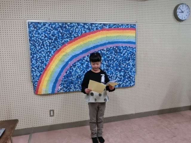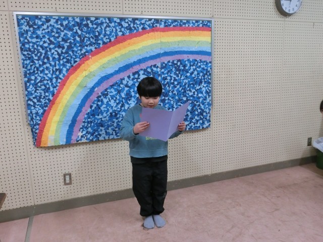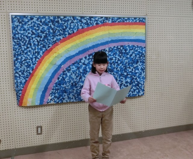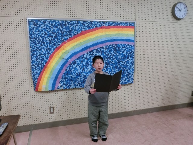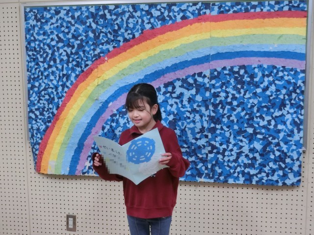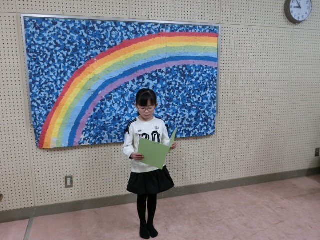 今日の2年生の発表を聞いて幸せな気持ちになったこと、そして発表した児童だけでなく、阪南小学校の児童一人一人がそれぞれの目標に向かって努力したことを褒めてくださいました。