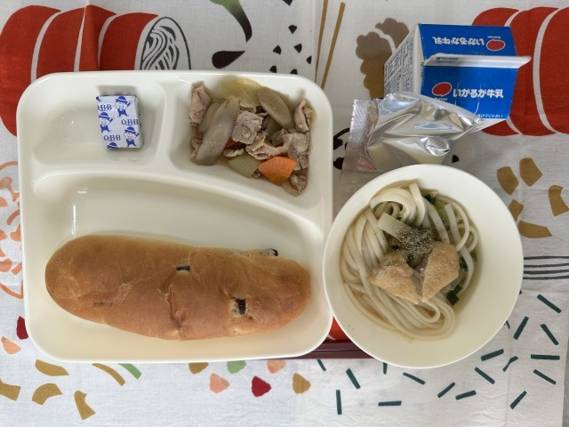 今日の給食は、豚肉とごぼうの煮もの、なにわうどん、固形チーズ、レーズンパン、牛乳です。