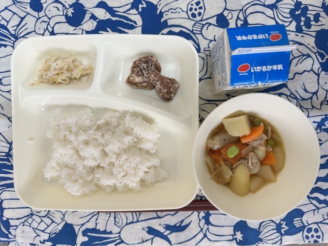 今日の給食は、くじらのたつたあげ、豚肉とじゃがいもの煮もの、もやしの甘酢あえ、ごはん、牛乳です。