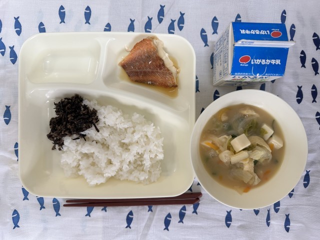 今日の給食は、あかうおのレモンじょうゆかけ、みそ汁、牛ひじきそぼろ、ごはん、牛乳です。