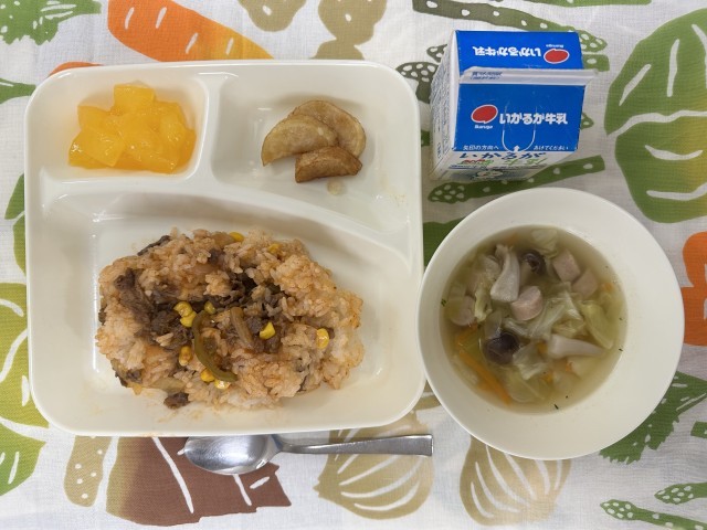 今日の給食は、ビーフケチャップライス、フライドポテト、キャベツのスープ、みかんゼリー、牛乳です。