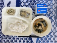 今日の給食は、えびのチリソースいため、中華がゆ、ソフト黒豆、コッペパン、みかんジャム、牛乳です。