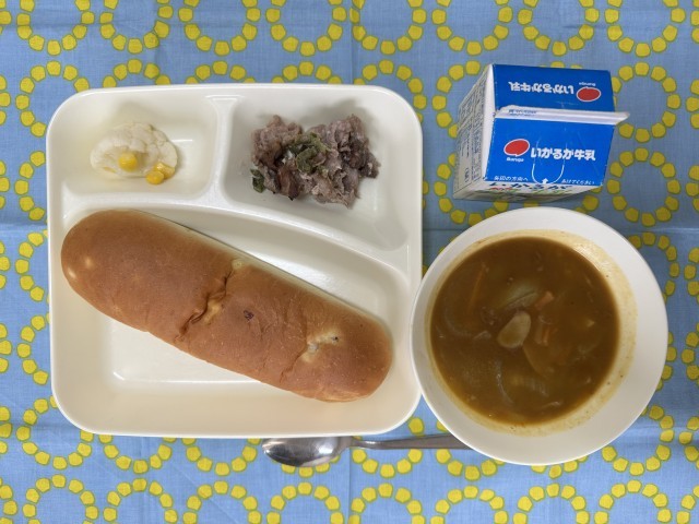 今日の給食は、豚肉の香味焼き、カレースープ、カリフラワーとコーンのサラダ、おさつパン、牛乳です。