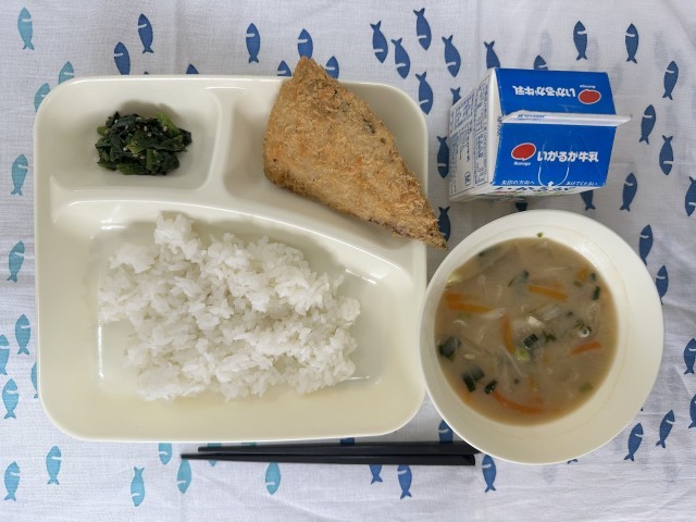 今日の給食は、いわしフライ、みそ汁、ほうれんそうのごまあえ、ごはん、牛乳です。