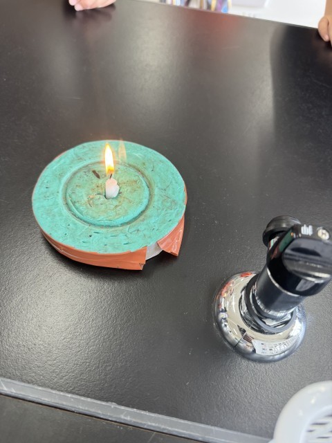ろうそくの火を使って、物が燃え続けるために必要な条件を調べる実験を行いました。