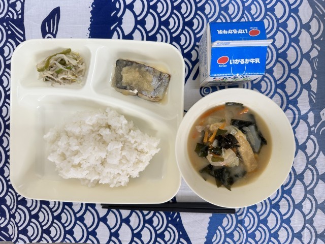 今日の給食は、さごしのおろしじょうゆかけ、みそ汁、もやしとピーマンのいためもの、ごはん、牛乳です。