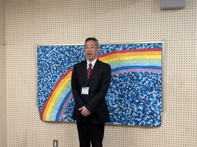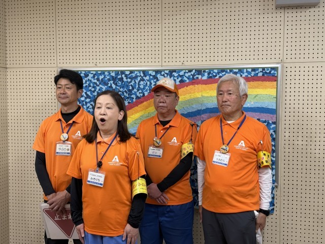 続いて、阿倍野区役所より地域見守り隊の方にお越しいただきました。阿倍野区内を自転車や青色防犯パトロール車で巡回し、子どもたちの安全を見守ってくださっています。