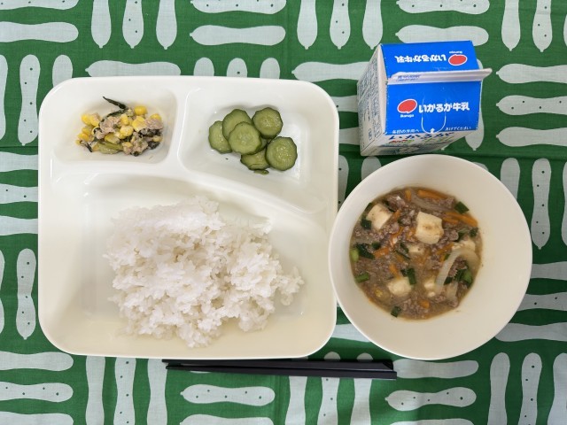 今日の給食は、マーボーどうふ、きゅうりの中華あえ、ツナとチンゲンサイのいためもの、ごはん、牛乳です。