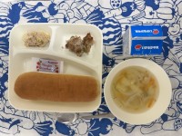 今日の給食は、豚肉のガーリック焼き、スープ、ツナとキャベツのソテー、コッペパン、...