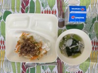今日の給食は、ビビンバ、トック、牛乳です。