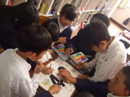 次に自分たちの旗をつくりました。低学年の人も絵を描いたり色を塗ったりして、みんなで協力して取り組んでいました。この旗は1年間を様々な場面で活用していきます。