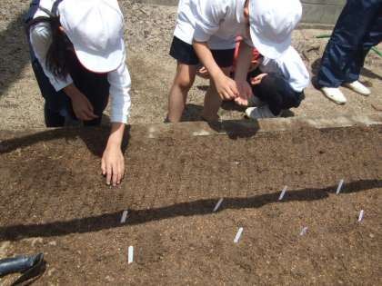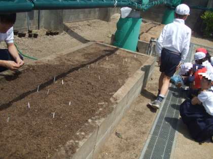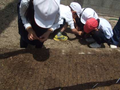 3年生は、理科の学習でいろいろな花の種を、学習園へ植えました。きれいな花が咲くように、みんなでがんばって育てていきます。