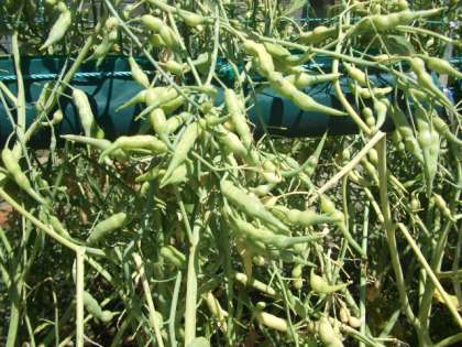 田辺大根の花が、次々と莢(さや)となっています。まだ緑色をしている莢ですが、中にはきちんと種が入っています。6月ごろには茶色になって収穫します。