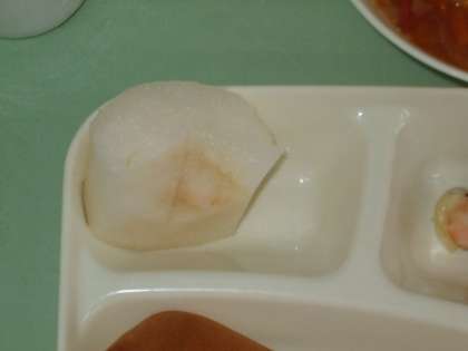 今日の給食は、えびグラタン・トマトスープ・なし(豊水)です。梨は、皮を剥き・芯を取りました。