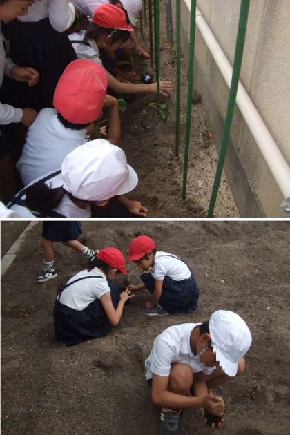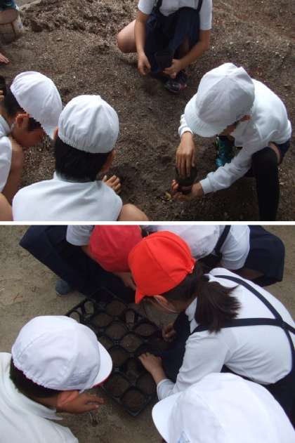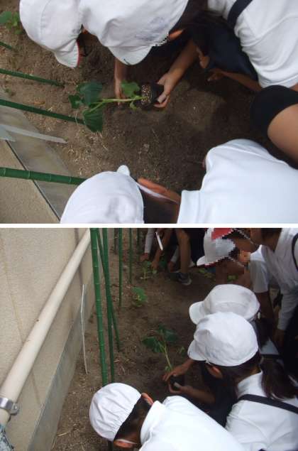 4年生は、理科の学習で、ヒョウタンの成長の観察をします。今日は、図書館裏の学習園にみんなでヒョウタンの苗を植えました。また、農園の土を育苗ポットに入れて、ヒョウタンの種も植えました。