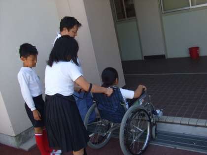 体育館から渡り廊下を通って、職員室の裏を通ってナッケ広場にもどるコースを体験しました。わずか数cmの段差でも通るのが大変なことが分かりました。